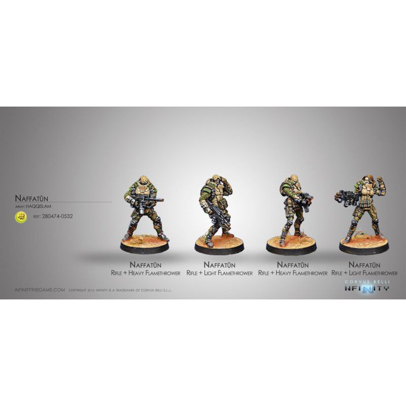 Les Naffatûns ont tendance à être laissés seuls au combat. Pensez-y bien. Ils transportent autant de matériel inflammable que possible. Leurs sacs à dos sont pleins de charges supplémentaires de napht (napalm hyper-concentré) et leurs lance-flammes sont remplis de gel incendiaire auto-accélérant sous pression. Un coup de chance, ou même une balle perdue, est susceptible de les immoler et de transformer leur environnement en un enfer ardent. Voudriez-vous vous tenir à leurs côtés ?