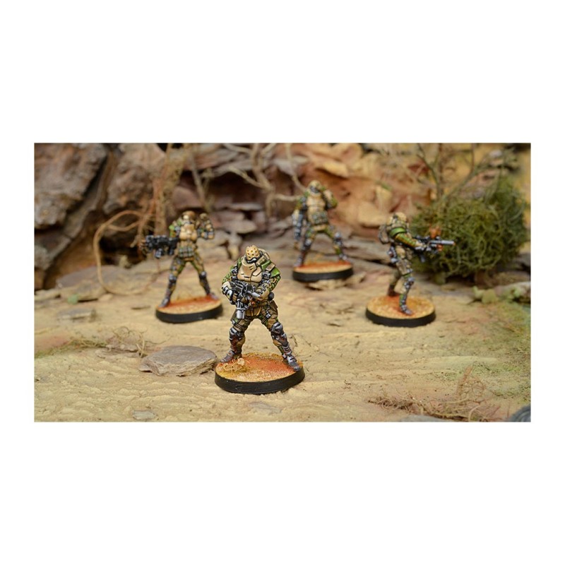 Ce blister contient 4 figurines en métal pour le jeu Infinity. Les socles sont inclus. Les figurines sont à assembler et à peindre.