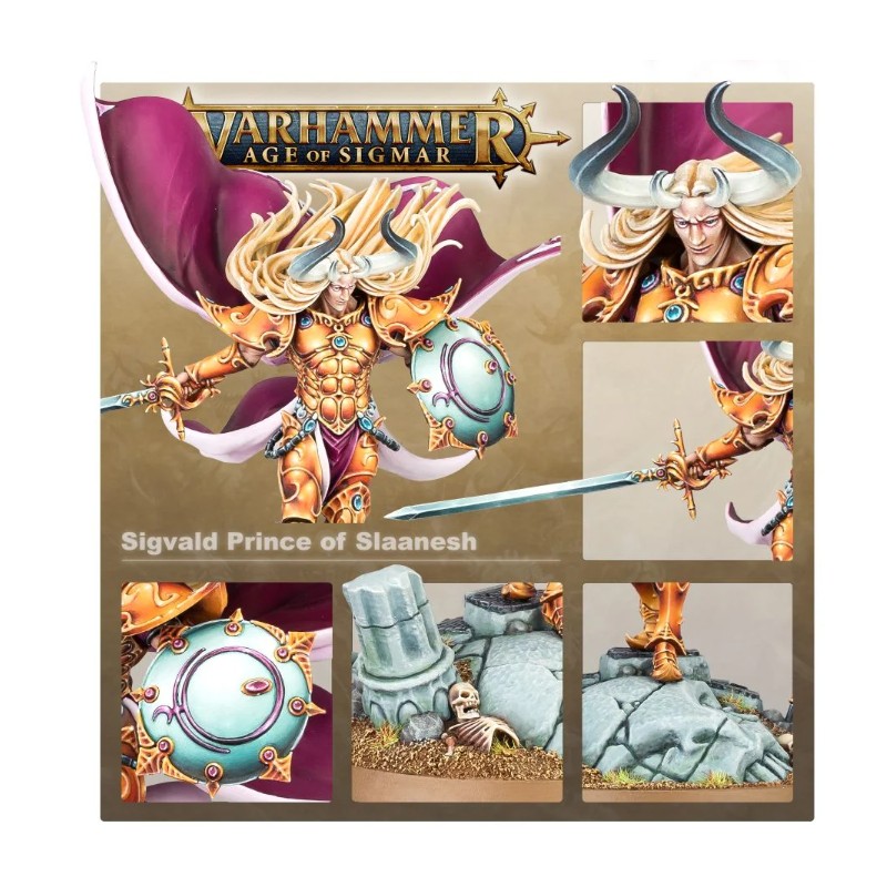 Description du produitSigvald le Magnifique se considère comme le fils favori de Slaanesh. Rares sont ceux qui osent remettre cet avis en question. Au combat, le Prince Verni est tel un mirage doré au rire cruel, dont l’élégante lame pourfend la piétaille aussi bien que les champions.