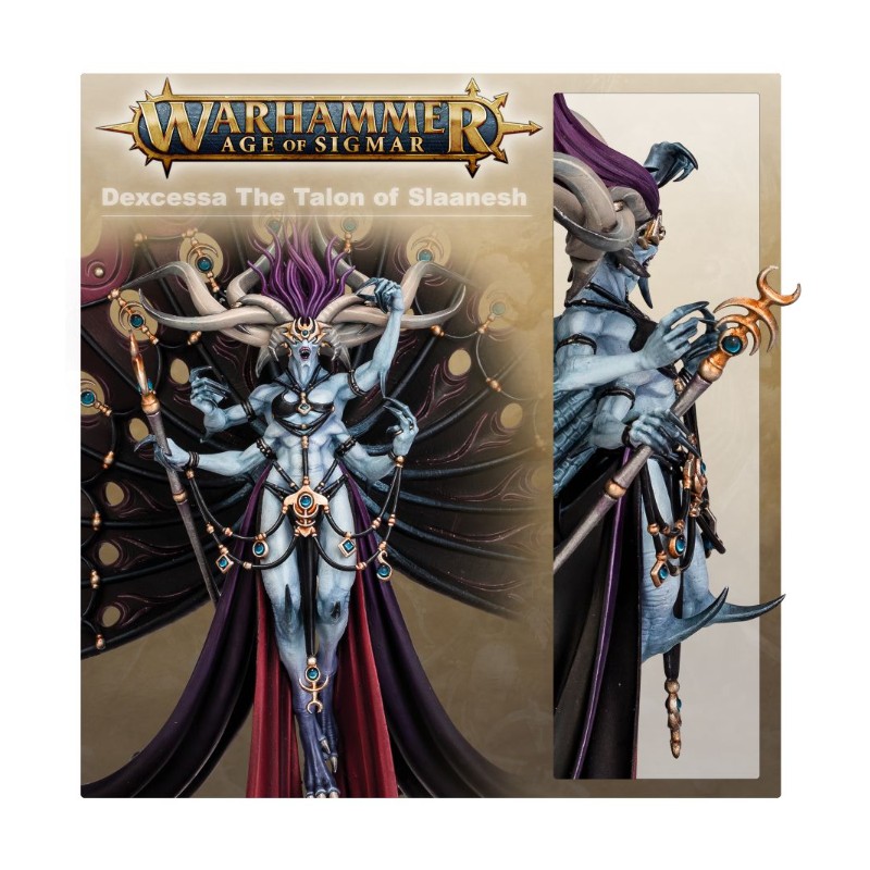 Ce kit plastique en 50 composants permet d'assembler une Dexcessa, the Talon of Slaanesh, et il est fourni avec un socle ovale Citadel de 105mm. On peut, sinon, assembler cette figurine sous la forme de Synessa, the Voice of Slaanesh.