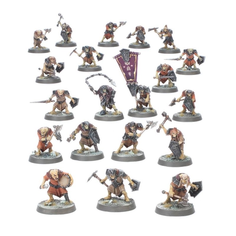 Ce kit en plastique permet d'assembler 20 Vandales Hobgrots, de l'infanterie légère pour vos armées de Forgeruines de Hashut dans les parties de Warhammer Age of Sigmar. Ils sont idéaux pour submerger l'adversaire, protéger des unités vitales et aller prendre des objectifs exposés. Équipés de boucliers et d'armes de récupération, incluant un mélange de marteaux, de lames et de piolets, ils sont prêts à se jeter au combat. Le kit inclut aussi les éléments pour assembler deux porte-étendard, musiciens et champions optionnels, armés au choix d'une dague ou d'une arme à chaîne.