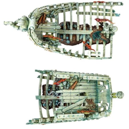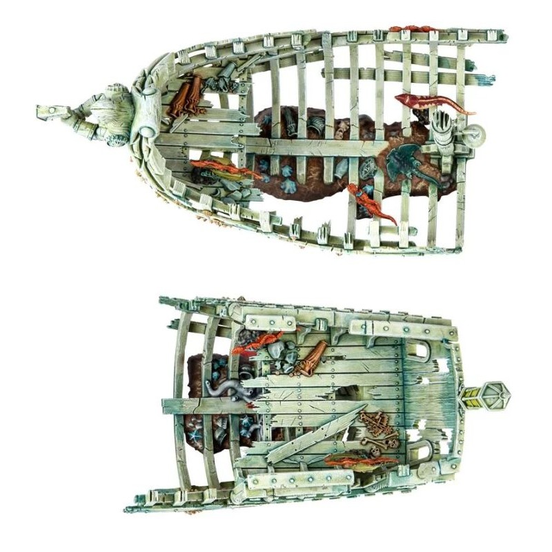 Ce kit plastique contient les composants nécessaires pour assembler une Gloomtide Shipwreck. Il s'agit d'un élément de paysage de Vortex Éthérique auquel ont accès les figurines d'allégeance Idoneth Deepkin. La Shipwreck proprement dite est une coque portant les stigmates de son séjour dans l'eau, les restes d'un navire oublié colonisé par les anatifes, les coraux et les êtres marins sympathisants des Idoneth. La figurine est en 2 pièces, qu'on peut disposer séparément sur le champ de bataille ou réunir en une grande épave – chaque moitié est incrustée de bernicles, jonchée d'ossements et de verroterie, et on y voit quelques accessoires nautiques comme un sextant cassé, les restes d'un gouvernail, une lanterne et une cloche. On trouve aussi des détails qui font allusion à la carrière du vaisseau au service de Sigmar, avec une figure de proue qui tient un marteau, une comète à deux queues sur le mât et une plaque à l'arrière. Il y a aussi 6 bancs de créatures marines, à ajouter selon votre gré à l'épave, ou bien comme excellentes décorations sur les socles de vos figurines d'Idoneth Deepkin.