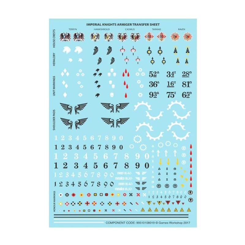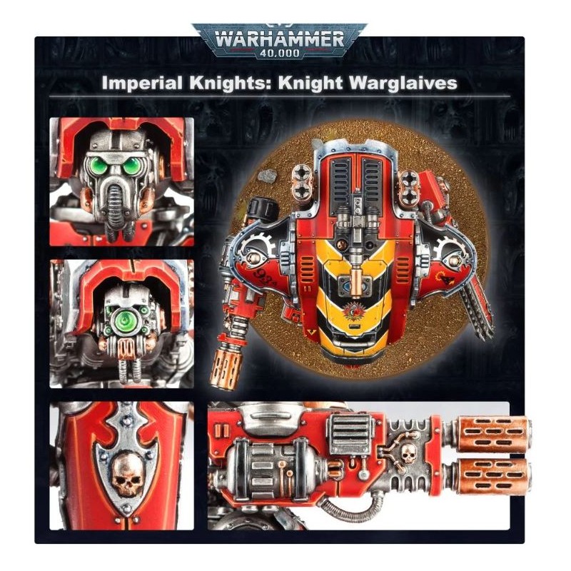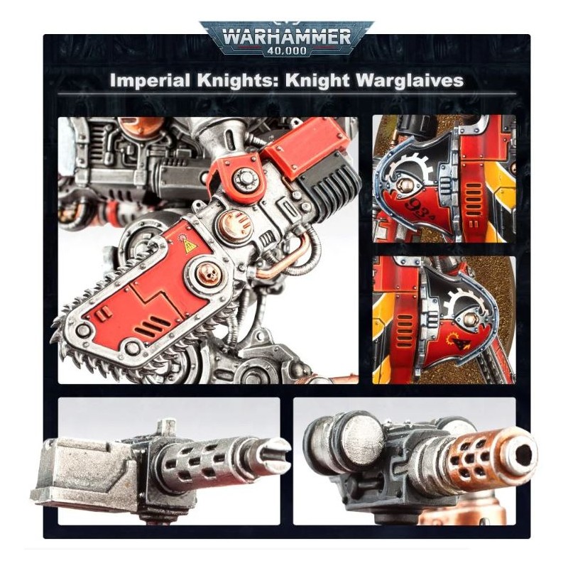 Ce kit se compose de 148 pièces en plastique, et est fourni avec 2 socles ovales Citadel de 100mm. Il comprend également une planche de décalcos d’Armigères représentant l’héraldique des Chevaliers Impériaux. Ces figurines sont fournies non peintes et nécessitent assemblage.