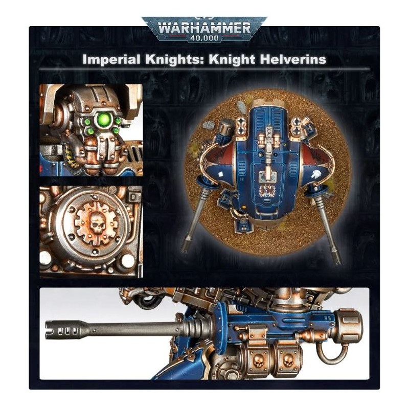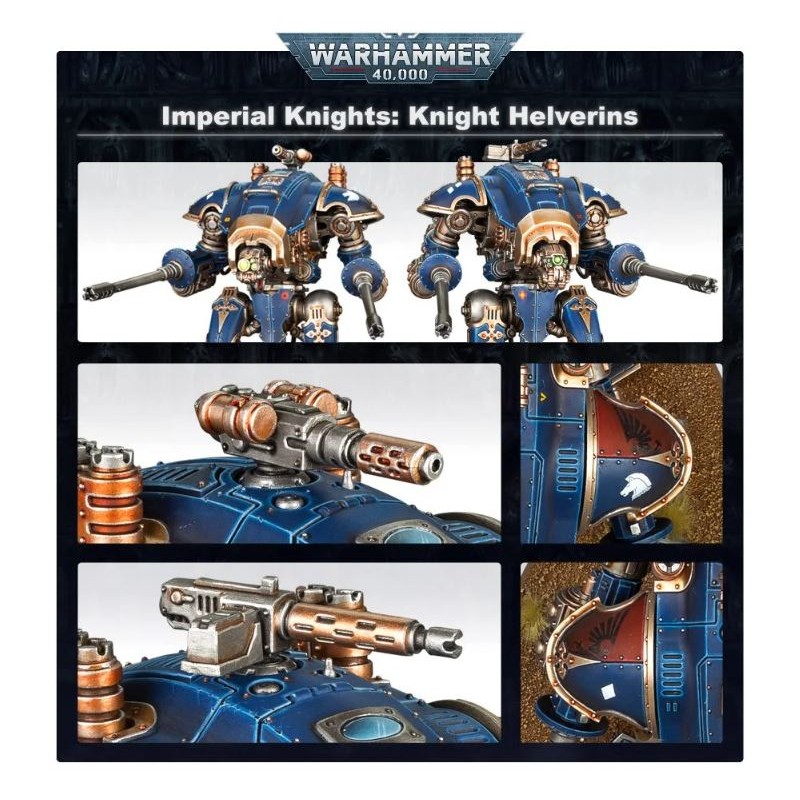 Ce kit plastique vous permet d'assembler deux Chevaliers de classe Armigère – soit des Armigères Hastaires, soit des Armigères Helvériens. Les Armigères Helvériens sont des choix de Seigneur des Batailles équipés pour le combat à distance qui peuvent fournir un appui-feu décisif à votre armée de Chevaliers Impériaux – ou être pris comme escadron de Sans-fiefs errants pour d’autres armées de l’Imperium. Dotés d’une paire d’autocanons à longue portée et, au choix, d’une mitrailleuse ou d’un fuseur de carapace, chaque Armigère Helvérien peut voir sa pose et sa silhouette personnalisées grâce à ses articulations, ses plaques d'armure et six plaques faciales uniques, et les amples sections de carapace autorisent les projets de peinture les plus ambitieux. Ce kit peut alternativement être assemblé en deux Dogues Exécuteurs ou Dogues Chasseurs pour les armées de Chevaliers du Chaos.