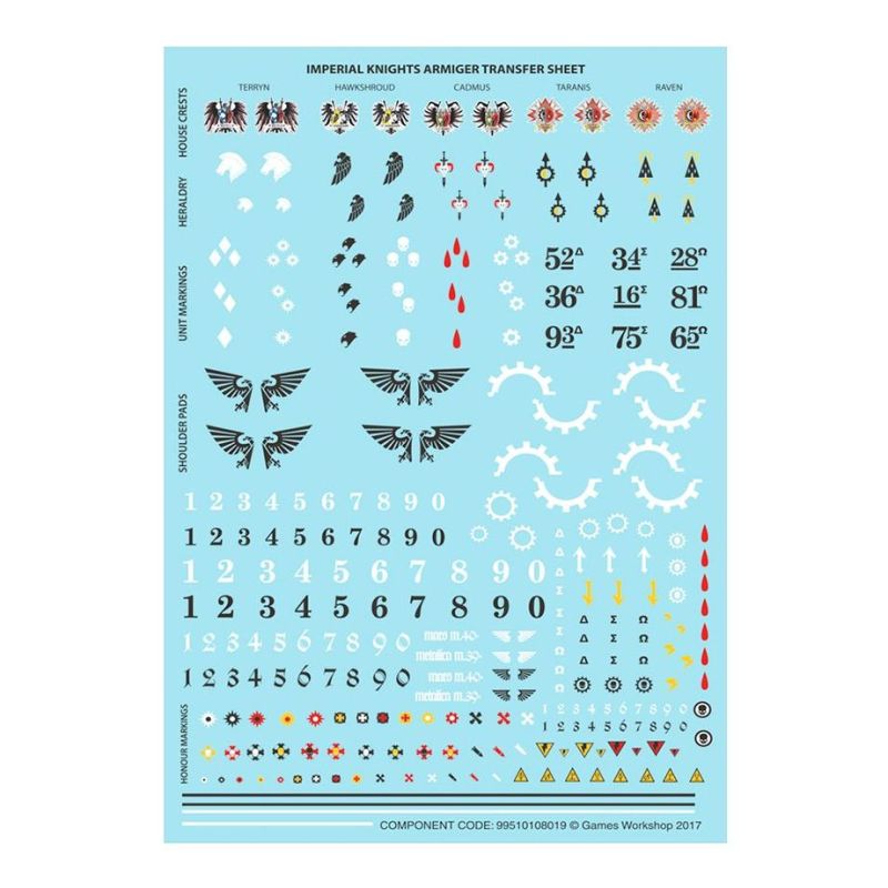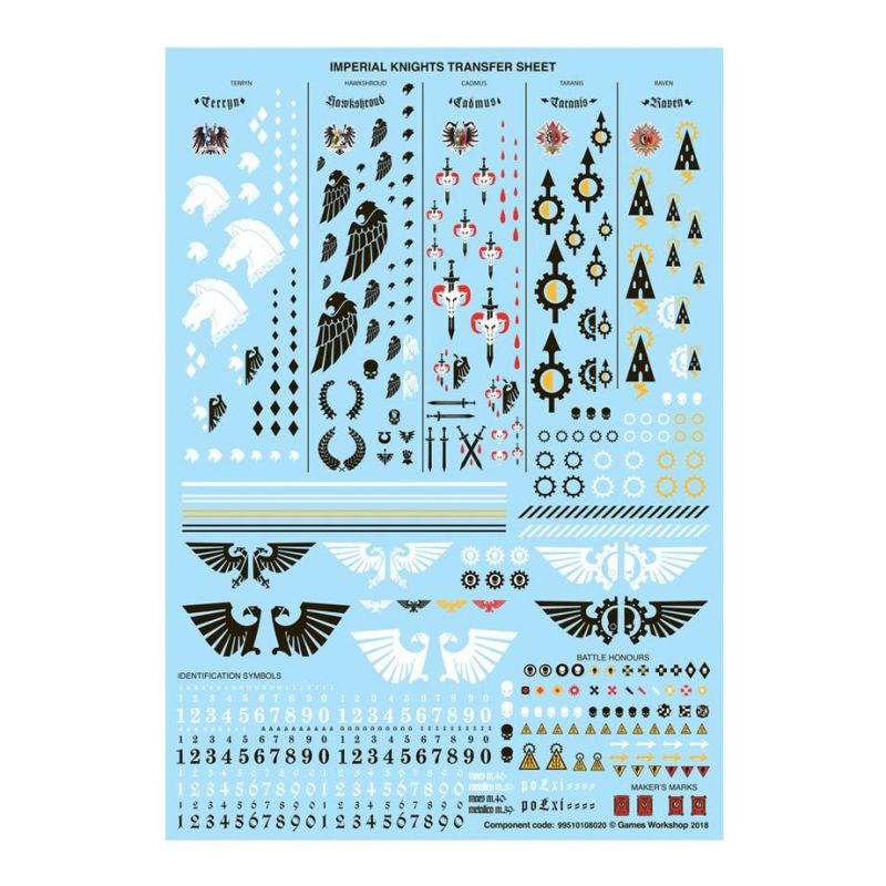 La Planche de Décalcos des Chevaliers Impériaux propose 583 décalcos de grande qualité. La Planche de Décalcos d'Armigères des Chevaliers Impériaux propose 277 décalcos de grande qualité. Ces planches proposent des décalcos des Maisonnées de Chevaliers Terryn, Hawkshroud, Cadmus, Taranis et Raven, ainsi que plusieurs marquages divers, comme des symboles d'identification, des honneurs de bataille et des poinçons de fabricant.