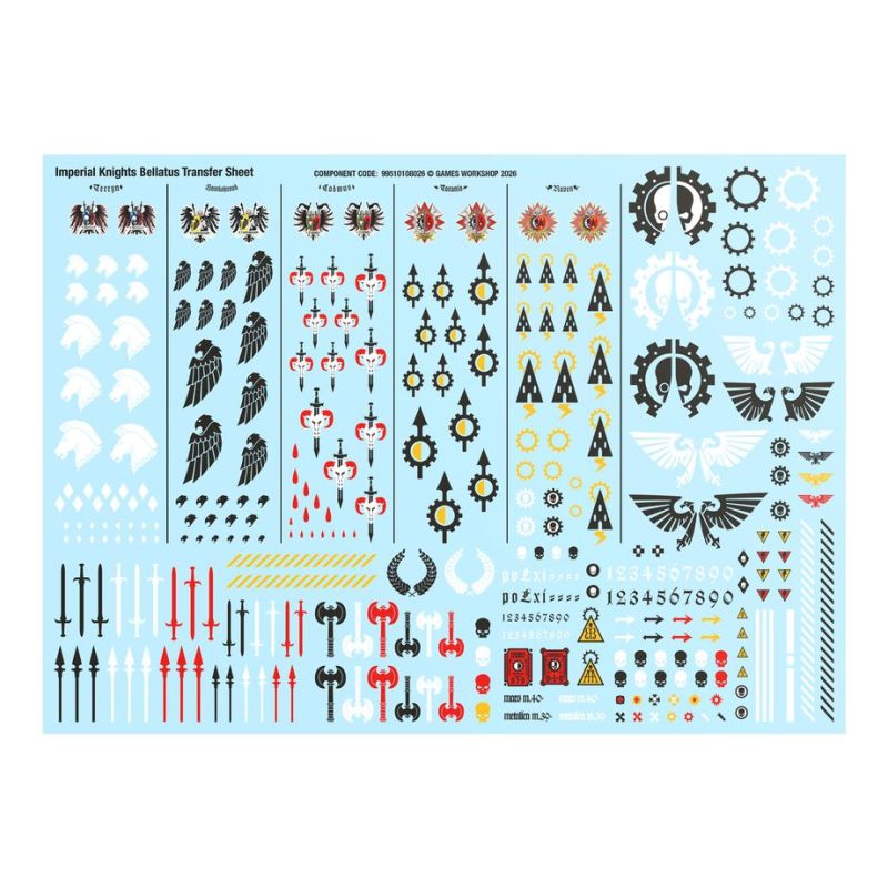 La Planche de Décalcos de Bellatus des Chevaliers Impériaux propose 351 décalcos de grande qualité, incluant des symboles des Maisonnées Terryn, Hawkshroud, Cadmus, Taranis et Raven, ainsi que des crânes, des chiffres et plus encore pour décorer votre figurine.