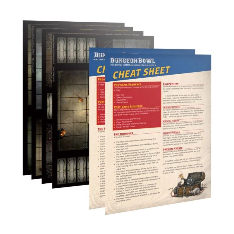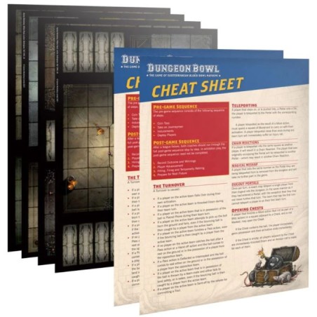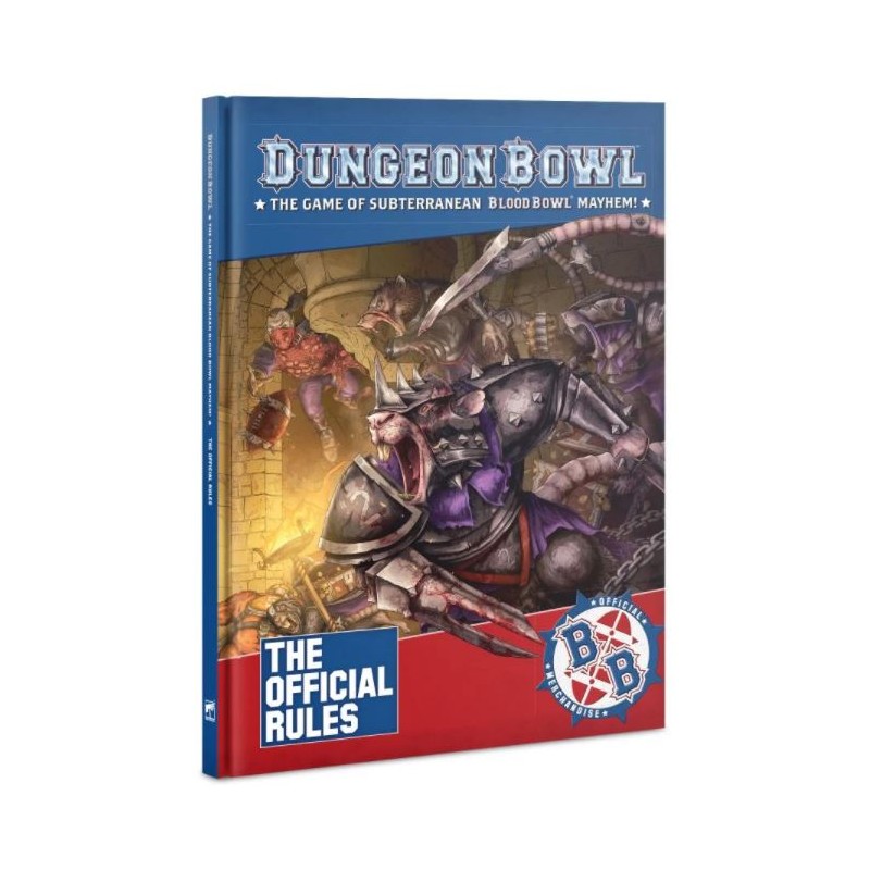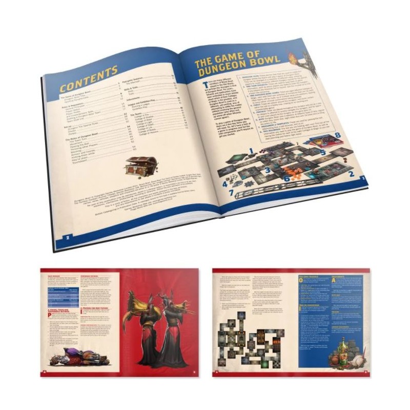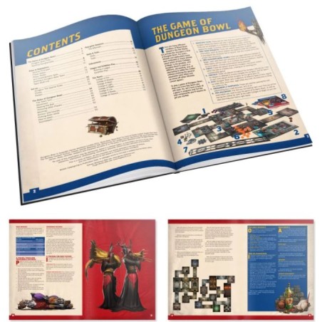 - Un livre de règles de 104 pages rempli d'illustrations de caractère du Dungeon Bowl et de toutes les règles dont vous avez besoin pour jouer au jeu, ainsi que des règles couvrant les matchs d'exposition et de ligue