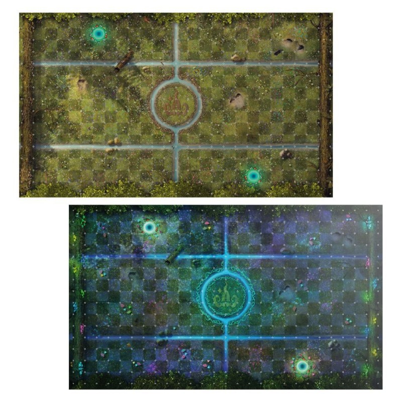 Un côté de ce terrain représente une clairière mystique, parsemée de fleurs sauvages, de petits animaux, de racines et de champignons. Le verso représente la même scène, mais éclairée par une étrange puissance magique qui fait pousser des bouquets de champignons. Les joueurs adverses se demanderont s'ils sont en train de rêver.