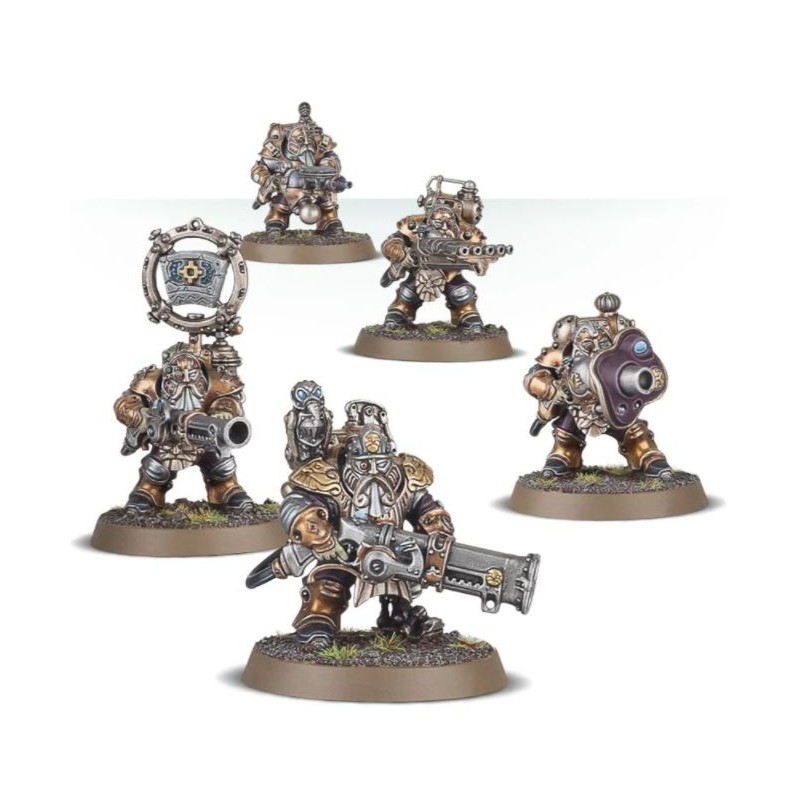 Ce kit plastique contient les pièces nécessaires pour assembler 5 Grundstok Thunderers, des soldats de métier qui forment la principale force armée des Kharadron Overlords. Chacun est doté d'un fusil à munitions éthériques, avec en option des armes spéciales singulièrement massives – un fumigateur éthérique, un mortier Grundstok (avec une bombe en plus pour décorer le socle), un éthercanon (si puissant que son servant duardin porte un bouclier déflecteur) et l'arme à cinq tubes baptisée balayeuse. Leurs scaphandres blindés sont bardés de conduits, de valves et d'un circuit respiratoire pour conditionner l'air à leurs poumons accoutumés à l'éther-or.