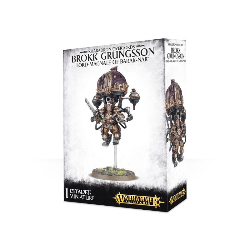 Ce kit plastique contient les pièces nécessaires pour assembler Brokk Grungsson, Lord-Magnate of Barak-Nar. Porté par son harnais dirigeable élaboré selon ses mensurations, il manie un canon conséquent appelé Rodomontade de Grungsson, une arme multitube baptisée Charte du Magnat et une scie éthermatique pour le combat rapproché. Il porte aussi des étheréclateurs montés dans son impressionnante moustache; telle est l'opulence associée à son rang!