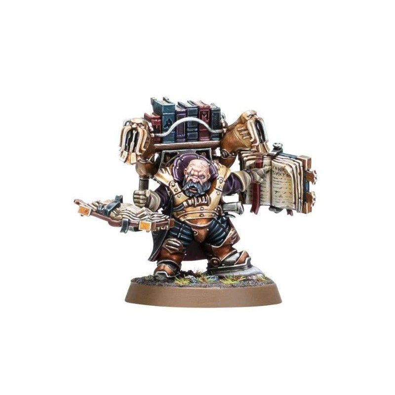 Ce kit plastique permet d'assembler un Codificateur, un juriste des Magnats Kharadrons connaissant les lois sur le bout des doigts. Armé de son savoir, et d'un pistolet à munitions éthériques, les actions du Codificateur sont soutenues par le lourd biblioharnais qu'il porte sur le dos. Cet appareil doté de plusieurs bras comportant une bibliothèque entière de textes duardins, ainsi qu'un haut-parleur avec lequel il prononce ses jugements. Il peut également utiliser ses membres renforcés par des pistons pour frapper les ennemis impertinents à coups de grimoire si nécessaire. Tout ça en écrivant de nouvelles notes de bas de page à la volée.