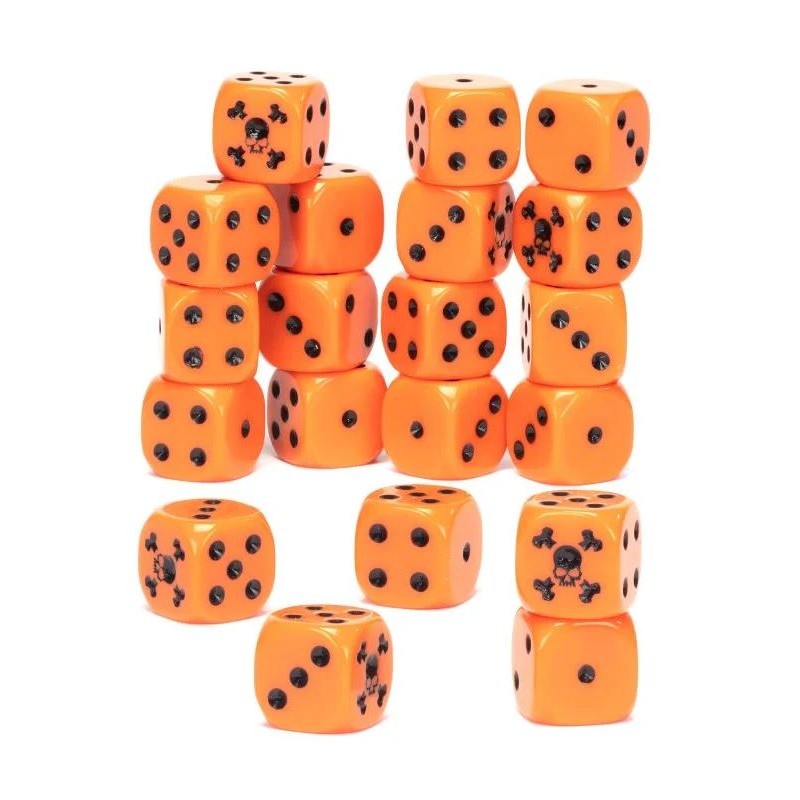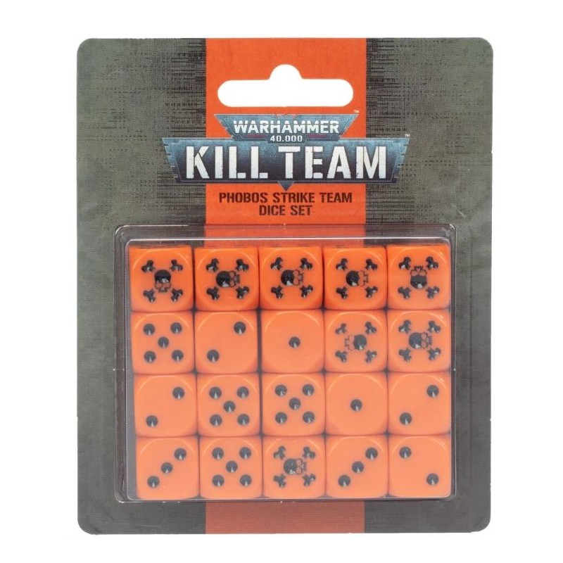 Ce set inclut 20 dés à six faces de 16mm de côté. Ils sont de couleur orange, avec des points noirs et une icône de l'Équipe d'Attaque Phobos sur la face du 6. Nous vous invitons à ranger ces dés dans un sac pour ne pas les perdre.