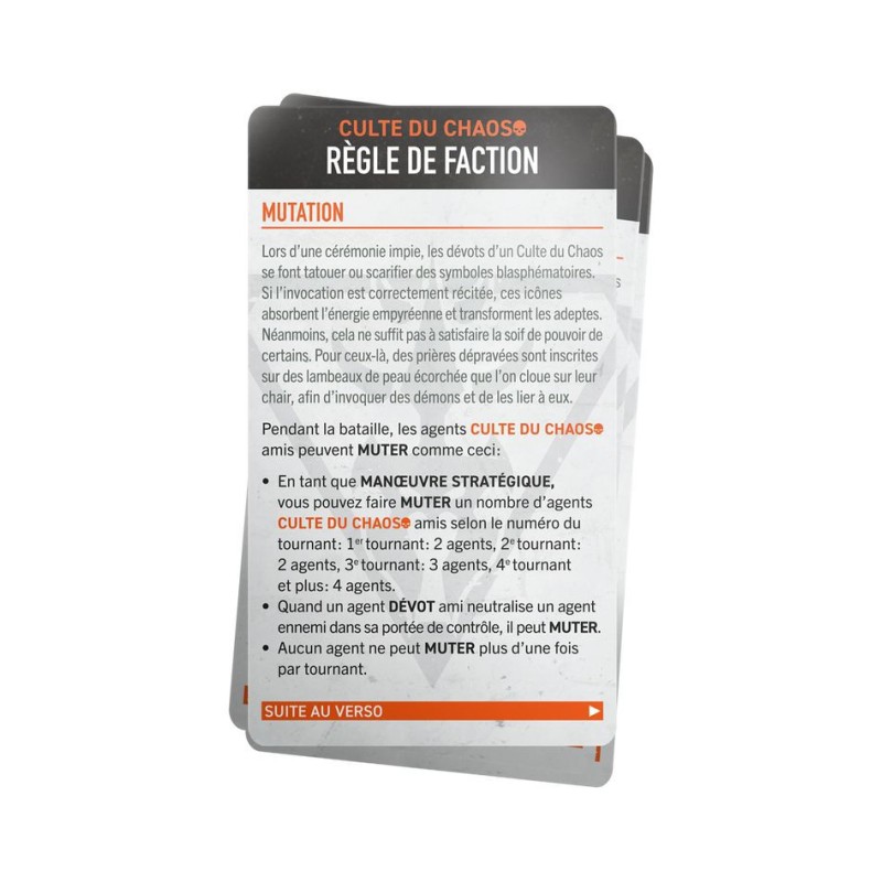 Ce pack contient les règles dont vous avez besoin pour déployer votre Culte du Chaos dans les parties de Kill Team. À l'intérieur, vous trouverez les règles de la kill team présentées sur des cartes de référence pratiques, dont les règles de sélection de la kill team, les cartes techniques des agents, les subterfuges stratégiques et d'affrontement, des règles de faction et d'équipement universel, et le guide de vos marqueurs et pions.