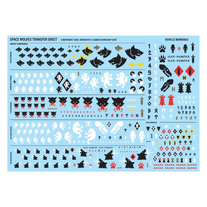 Ce kit est fourni avec 1x Planche de Décalcos Space Wolves, comprenant 419 décalcos de grande qualité. Celles-ci incluent des symboles pour les Grandes Compagnies des Crinières Noires, des Champions de Fenris, des Gueules Sanglantes, des Esprits-Loups et des Loups de la Mort, ainsi que des marquages de véhicule et de saga.