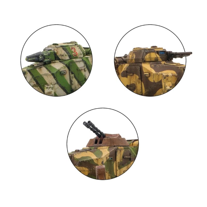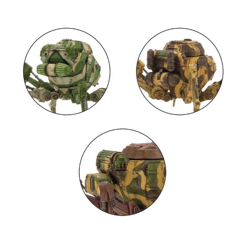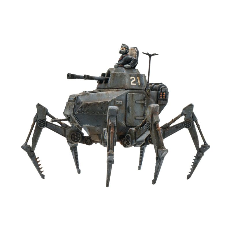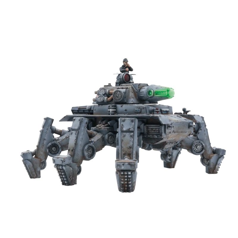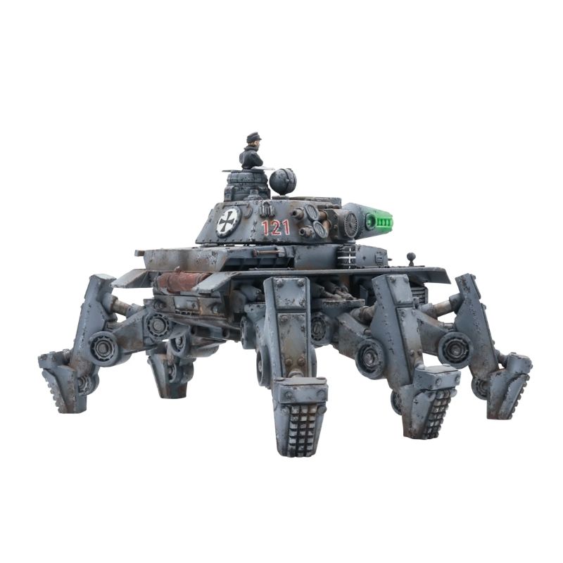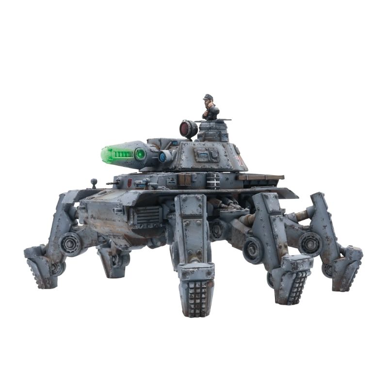 Ils sont soutenus par un peloton blindé, avec un marcheur léger Vogelspinne qui avance en tête de la ligne. Ce marcheur rapide et polyvalent peut être équipé d'une grande variété d'armes pour accomplir différentes missions, et compense son blindage léger par une grande mobilité. À ses côtés se trouve un Panzer IV Ausf. X. Alliant le châssis éprouvé du Panzer IV à six puissantes jambes et à un projecteur gravitationnel Schwerefeld, ce char ambulant peut littéralement écraser l'infanterie et les véhicules ennemis, tant à distance qu'à courte portée.