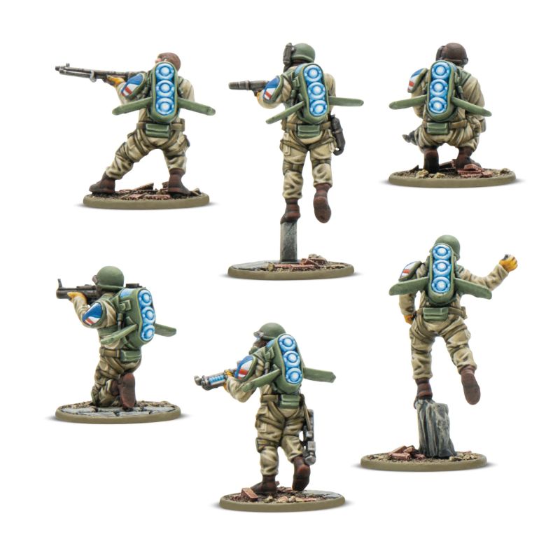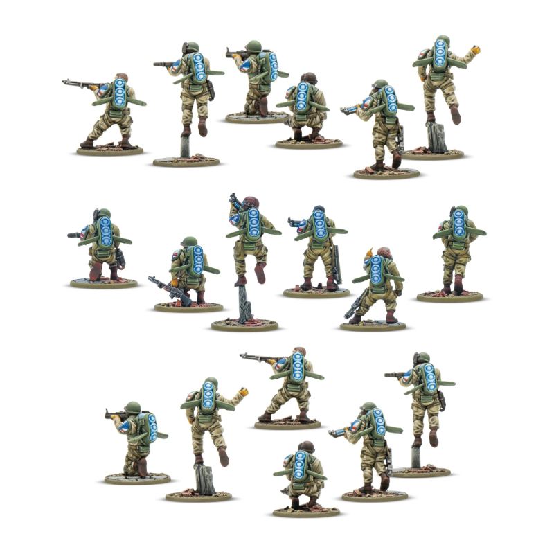Ce coffret en plastique contient 18 Fireflies américains en plusieurs parties, équipés d'une gamme d'armes comprenant des mitraillettes M1X Thompson Rift, des lance-flammes mortels et des lance-roquettes antichars.