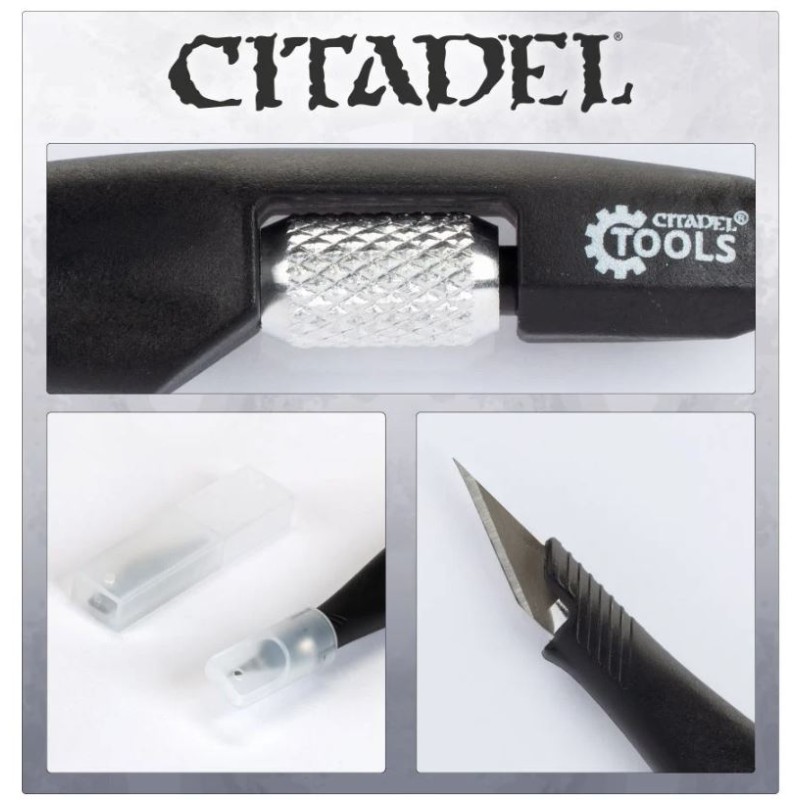 Description du produitTout adepte du hobby Warhammer a besoin d'un couteau de modélisme. L'équipe de conception de Citadel Tools en a donc créé un juste pour eux. Il dispose d'une poignée en plastique dur sculptée et comprend plusieurs fonctions de sécurité et de praticité :