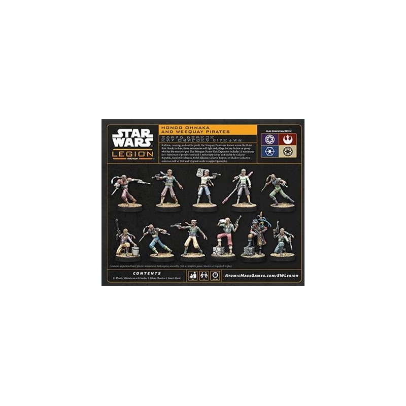 Cette extension contient 10 figurines pour constituer une unité de mercenaires utilisable par la République Galactique, l’Alliance Séparatiste, l’Alliance Rebelle, l’Empire Galactique ou les armées du Collectif de l’Ombre. On y trouve un chef pirate Weequay, six Weequay, des soldats pirates et deux Weequay à armes lourdes, ainsi que cartes Unité et d’Amélioration pour soutenir gameplay. C’est une unité à courte portée qui brille dans le combat au corps à corps.