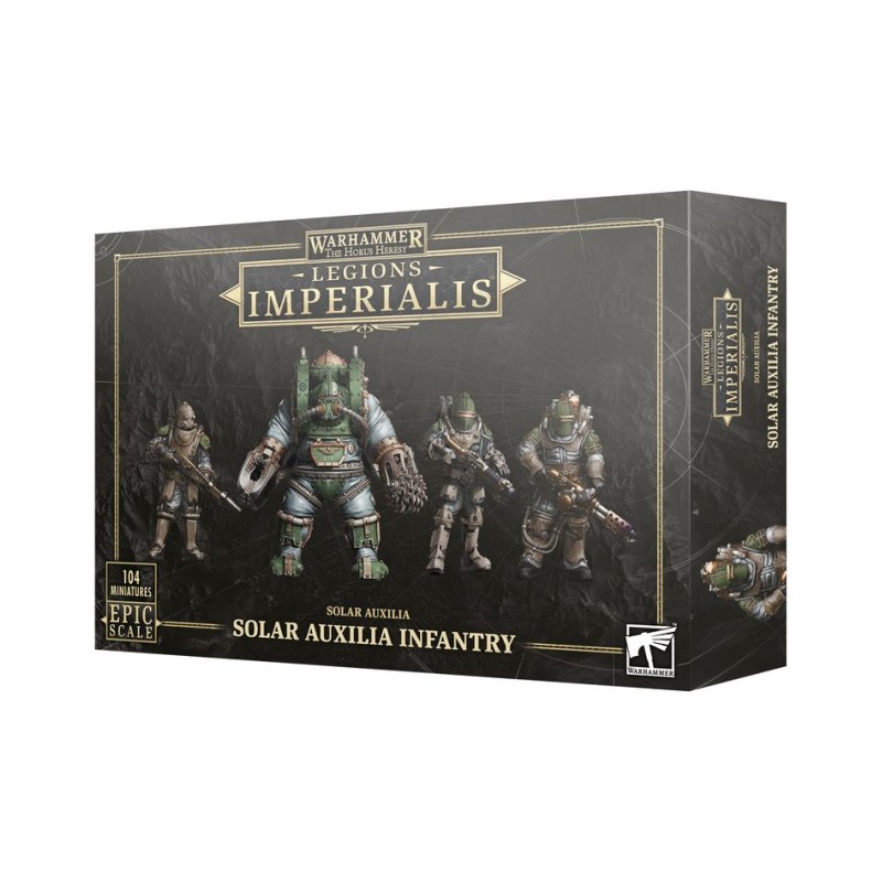 Ce kit plastique permet d'assembler 104 figurines des Solar Auxilia à l'échelle epic, réparties sur 26 socles. Des Tercios équipés de fusils laser qui constituent les fantassins des Auxilia aux Veletarii d'élite armés de haches, les Solar Auxilia se tiennent prêtes à prendre et tenir leurs objectifs en appliquant leur discipline inflexible et la puissance pure de leurs effectifs. Soutenus par les Commandants Légats, des escadrons de lance-flammes, les énormes Ogryns Charonites, et les Sentinels Lourds Aethon, ils jouissent d'une puissance de feu mortelle qui surprendra quiconque sous-estime leur valeur de soldats mortels.