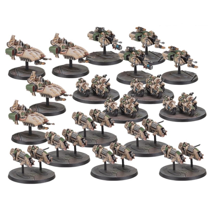 Ce kit en plastique permet d'assembler 32 figurines des Legiones Astartes à l'échelle epic pour vos parties de Legions Imperialis. Vous trouverez des Javelin et des Land Speeders plus petits avec divers choix d'armes, ainsi que des motos Outrider et des motojets Scimitar. Déchaînez ces atouts rapides pour contourner votre adversaire et employer votre puissance de feu là où il s'y attend le moins.