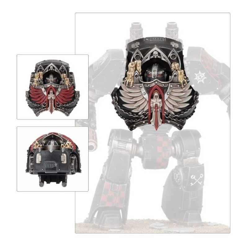 Ce kit d'amélioration permet de personnaliser un Dreadnought Contemptor avec une nouvelle tête et un nouveau torse en résine, sur le thème de la Légion des Dark Angels. La tête a une apparence gothique caractéristique, tandis que le torse arbore l'armure ailée de la Légion I sous la forme d'une statuette d'ange brandissant une épée, ainsi que des éléments tels que des bandes d'armure cloutées, des chaînes et un capuchon baroque en forme de sanctuaire avec des bougies votives pour honorer le guerrier déchu qui s'y trouve. Ce kit est parfait pour ajouter le look I Legion à vos puissants Dreadnoughts Contemptor.
