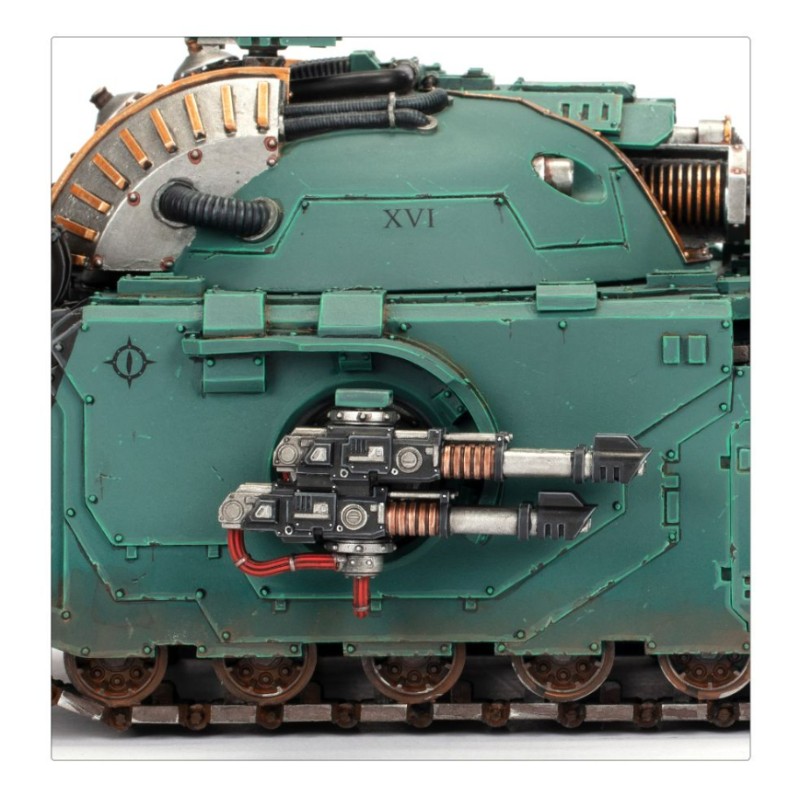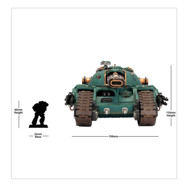 La tourelle et les bolters lourds du char sont en résine, tandis que sa coque est un mélange de composants en résine et en plastique. Il est également équipé d'une paire de lascannons en plastique montés sur des socles, qui peuvent compléter son arme principale ou s'attaquer à des cibles moins blindées. La tourelle, les armes montées sur la coque, et les béquilles peuvent toutes être assemblées sans colle, ce qui vous permet d'ajuster leur positionnement en cours de combat.