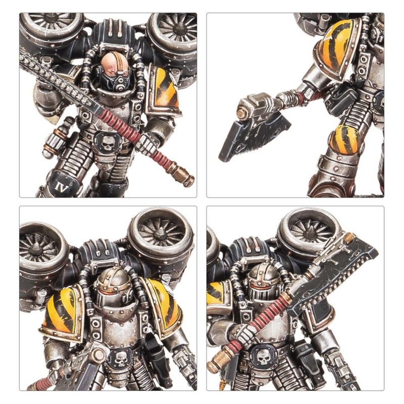 Le kit comprend les éléments nécessaires pour assembler deux Sergents, qui peuvent chacun être armés d'un pistolet désintégrateur ou d'une serpentine volkite, ainsi que d'une masse énergétique et d'une bombe à fusion. Chaque membre de l'escouade peut échanger son pistolet bolter contre un bouclier de combat pour mieux résister aux dégâts tandis qu'ils traversent le champ de bataille sur des colonnes de feu. Deux Légionnaires peuvent en outre être armés d'une hache tronçonneuse lourde pour renforcer leur impact. Vous trouverez 16 têtes en huit modèles différents, ainsi que des grenades, des sacoches et des holsters pour personnaliser vos figurines.
