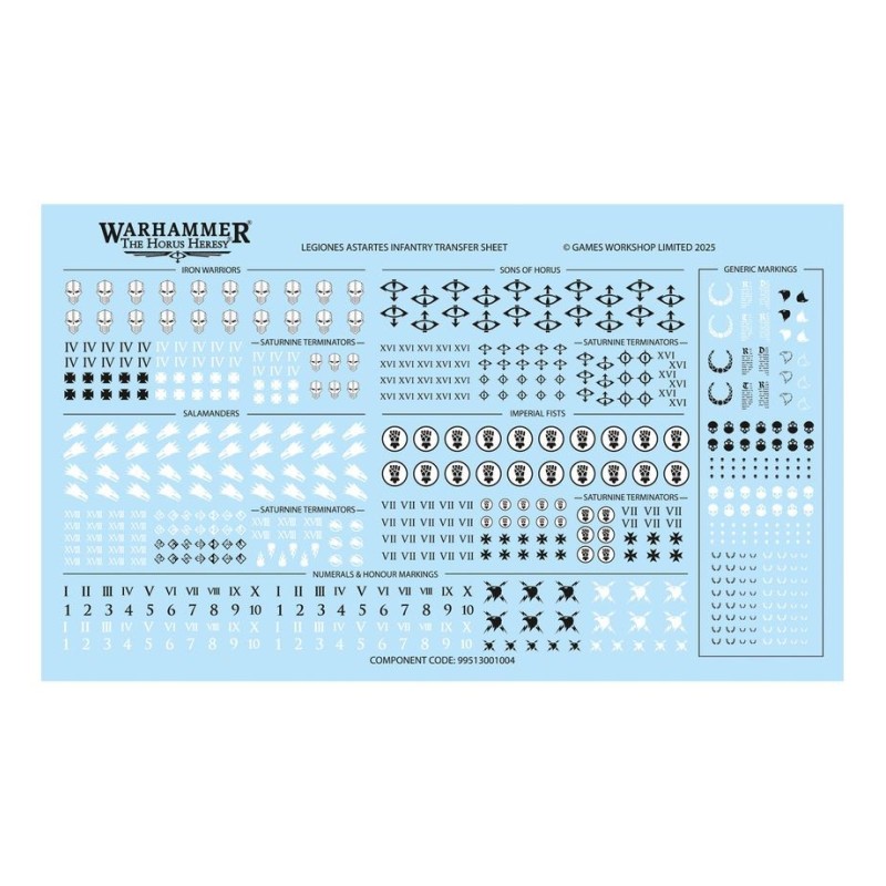 Ce kit est fourni avec 1x Planche de Décalcos d'Infanterie des Legiones Astartes comprenant 618 décalcos de grande qualité, dont des symboles des Légions des Iron Warriors, des Sons of Horus, des Salamanders et des Imperial Fists, ainsi que des chiffres, des marques d'honneur, des marquages génériques, des écritures et des icônes de commandement.