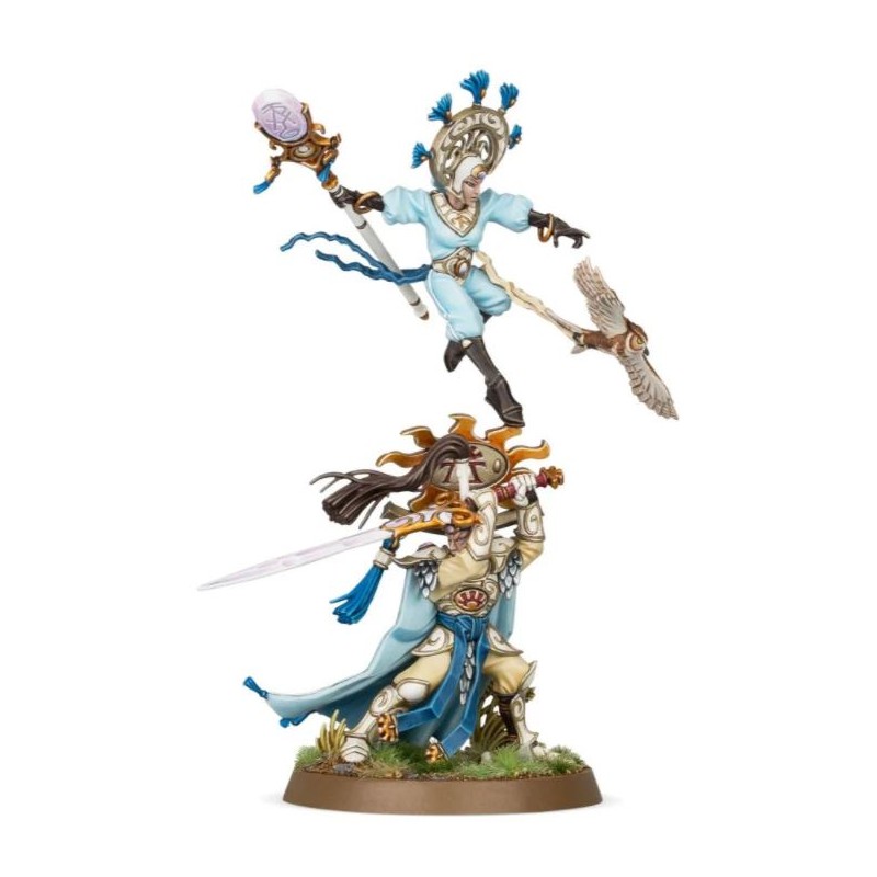 Alliés accessibles à toutes les armées dirigées par un général de l'Ordre, ces jumeaux conjuguent en une seule figurine des capacités exemplaires aussi bien physiques que magiques, pour lancer des sorts puissants tout en prenant l'ascendant en combat rapproché. L'épée divine Altairi et le bâton divin Dianaer rendent le soutien à vos alliés et la destruction de vos ennemis on ne peut plus faciles pour ces héros des Lumineths.