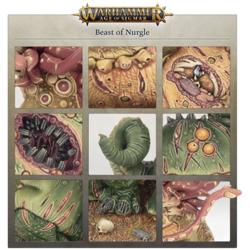 Ce kit plastique contient les composants nécessaires pour assembler une Beast of Nurgle. Elle ne porte pas d'armes, mais elle étouffe ses victimes avec ses griffes, ses tentacules et sa langue baveuse. Il y a trois options pour son corps bouffi, qui se fixent à l'assemblage de base – une à gueule de lamproie, une avec des entailles profondes et une avec une plaie béante qui révèle les organes internes. Il y a deux variantes de mains, avec à chaque fois une tendue et une sur laquelle la bête s'appuie – il y a une paire à membranes et une à griffes, avec deux paires de pieds assortis. Trois faciès différents sont proposés, tous plus déments l'un que l'autre – un de cyclope, un avec une icône de Nurgle en guise d'œil et un avec une paire d'yeux qui semblent crever le crâne. Il y a aussi deux couronnes de tentacules, et deux langues.