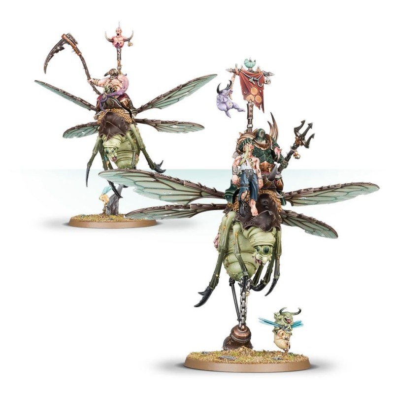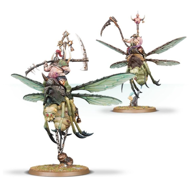 Ce kit plastique contient les composants nécessaires pour assembler 2 Pusgoyle Blightlords. Chacun d'eux chevauche une énorme Rot Fly, un insecte repoussant aux quatre ailes diaphanes, qui bourdonne dans le ciel en dégouttant de liquides immondes et corrosifs. Ce genre de mouche pestiférée a de longs membres grêles mais un abdomen bouffi, des yeux trop nombreux et des mandibules horribles. Les Blightlords sont quant à eux ignobles – il y en a un qui a une gueule béante dans le ventre, et l'autre est affligé de varices, de tentacules et d'icônes de Nurgle. Les deux figurines ont une perche attachée dans le dos, qu'on peut munir d'une bannière de toile, d'un symbole de Nurgle en métal, ou encore (et c'est quelque chose) un cadavre empalé pourri et exprimant la souffrance brute. Le duo est muni d'armes corrodées massives, faux ou trident, et on peut lui mettre des têtes nues ou couvertes affreusement détaillées. Il y a trois compagnons Nurglings – un avec encensoir, un chevauchant une petite mouche à peste, et le dernier mâchouillant gaiement ses propres intestins…