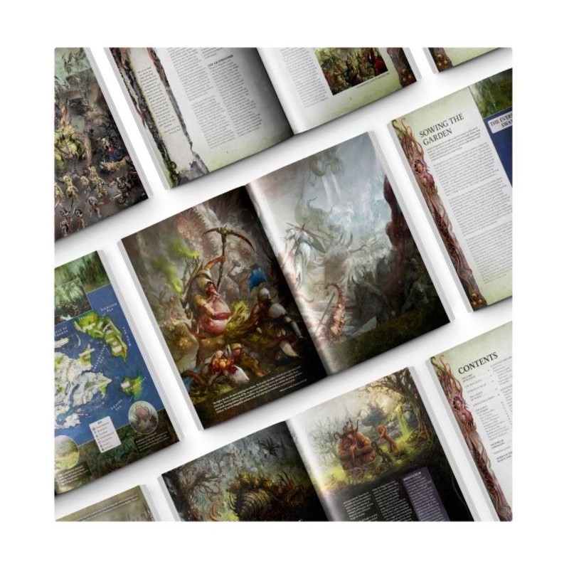 - Des règles de campagne Pour la Gloire vous permettant d'entreprendre des quêtes pour semer les graines du Jardin de Nurgle et batailler sur des champs de bataille flétris