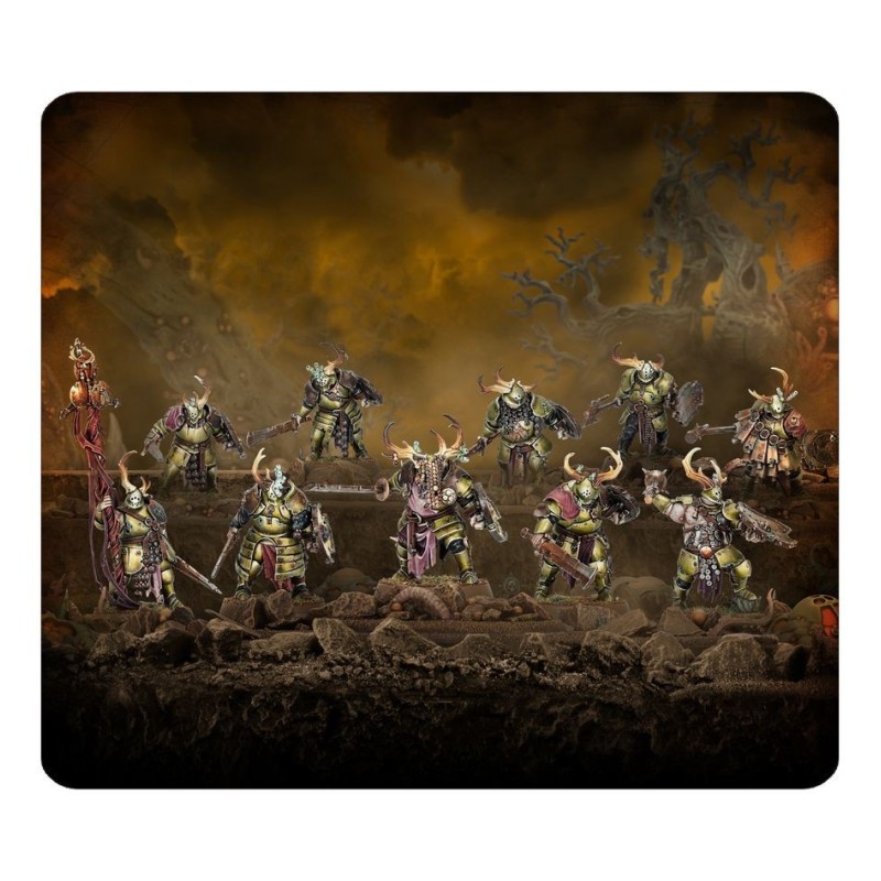 Ce kit en plastique permet d'assembler 10 Putrépées, des fantassins mortels et lourdement protégés pour vos armées de Putrescents de Nurgle dans les parties de Warhammer Age of Sigmar. Engoncés sous de lourdes plaques de métal rouillé, ils sont très difficiles à abattre et sont ainsi particulièrement efficaces pour tenir les objectifs. Chaque Putrépée peut être équipé d'une paire d'armes de corps à corps mortelles et souillées, ou d'une arme et d'un bouclier. Les armes de main droite et les boucliers de main gauche sont interchangeables entre les figurines, tout comme les 12 têtes que contient le kit, ce qui permet de personnaliser facilement votre unité. Vous y trouverez également les éléments nécessaires pour assembler un champion, un musicien et un porte-étendard optionnels, avec un choix de deux sommets de bannière.