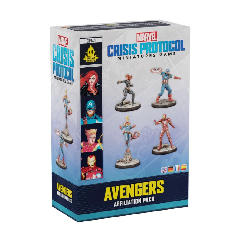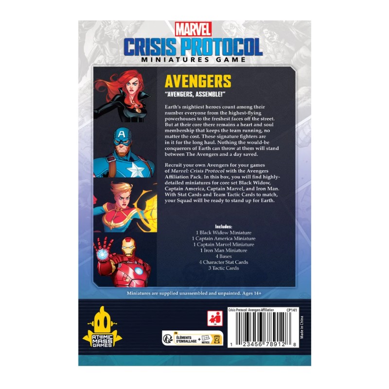 Le pack d'affiliation des Avengers regroupe les personnages affiliés aux Avengers présents dans le Core Set original de Marvel : Crisis Protocol, dont Captain America, Captain Marvel, Black Widow et Iron Man, dans une seule et même boîte accessible.
