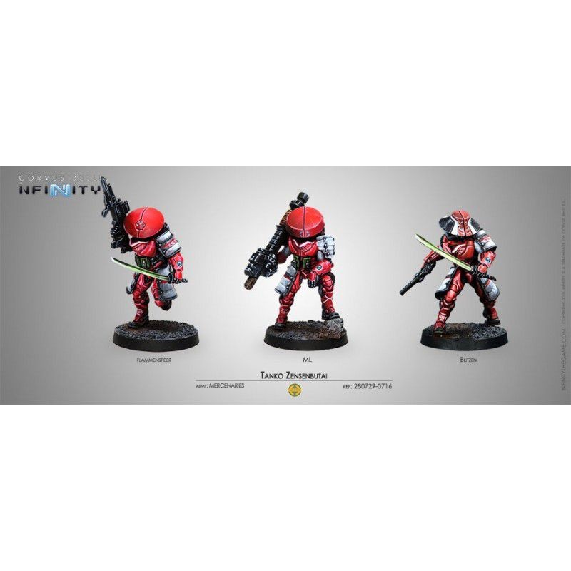 Comme le veut la tradition de la JSA, la nouvelle unité a été baptisée d'après son nouveau modèle d'armure, et c'est ainsi que le Tankō est né pour maintenir le rôle opérationnel autrefois rempli par les Haramaki : celui d'un régiment de combat rapproché en première ligne. Tout comme ses prédécesseurs, Tankō a tendance à provenir de familles ouvrières et de dojos provinciaux de peu d'importance. Ils ont la réputation d'être turbulents et hautains, toujours prompts à faire étalage de leur statut de samouraï acquis - au grand chagrin du solennel Domaru, né dans le bush. Habitués à la rareté des pièces de rechange, les Tankō ont poussé à l'extrême les possibilités de leur armure modulaire, et ils sont devenus tristement célèbres pour leur habitude de détourner ou de voler carrément des livraisons de fournitures. Par conséquent, il n'y a pas deux tenues blindées dans le Tankō Zensenbutai qui ont exactement la même configuration et les mêmes ornements. Mais, malgré leur apparence hétéroclite, ces troupes sont de véritables samouraïs et ne se déroberaient jamais à leur devoir à l'avant-garde de chaque offensive JSA. De par sa conception et son caractère, le Zensenbutai Tankō est une force de choc absolument mortelle, aguerrie par sa présence constante là où le combat est le plus féroce et où le courage est obligatoire.