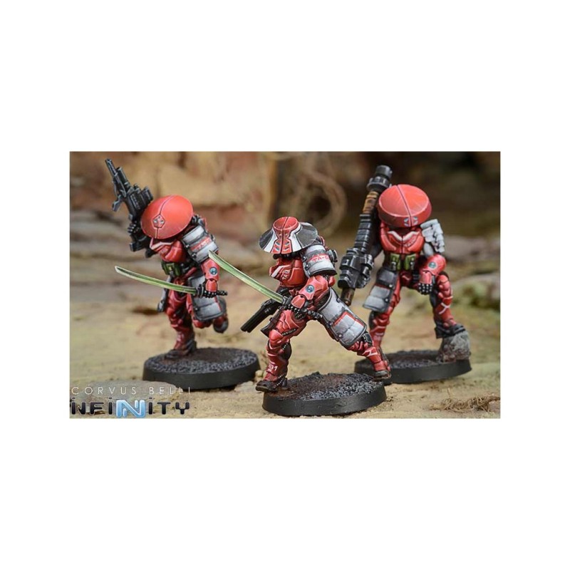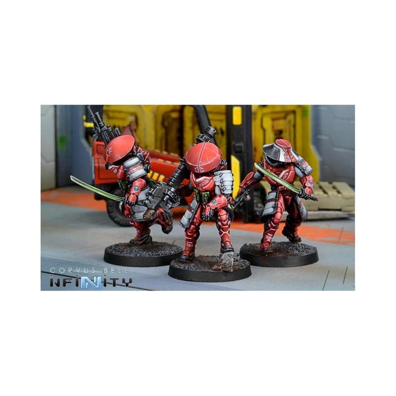 Ce blister contient 3 figurines en métal pour le jeu Infinity. Les socles sont inclus. Les figurines sont à assembler et à peindre.