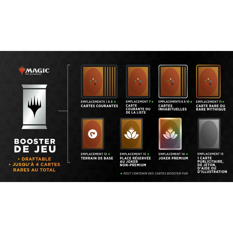 - 1 carte premium à rareté aléatoire (mythique, rare, unco ou commune)
