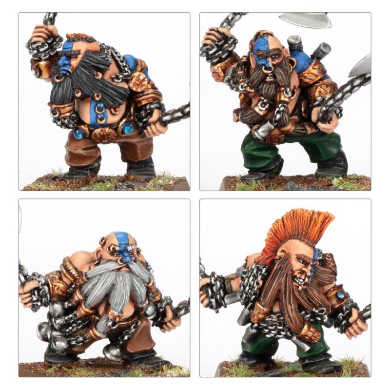 Ce kit en métal permett d'assembler quatre figurines d'état-major pour les Tueurs Nains: un porte-étendard, un musicien doté d'un cor et deux Tueurs vétérans parfaits pour représenter des Tueurs de Géants. Un de ces Tueurs vétérans est armé d'une grande hache ornementée, tandis que l'autre manie deux haches jumelles. Chacune de ces figurines arbore une crête distincte, des barbes décorées et les muscles saillants et nus d'un véritable Tueur, ce qui les rend parfaits pour faire ressortir vos unités et leur trouver la mort qu'elles méritent!