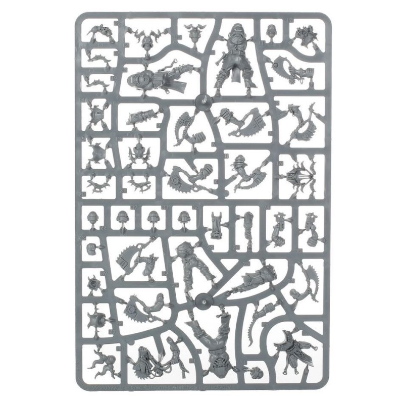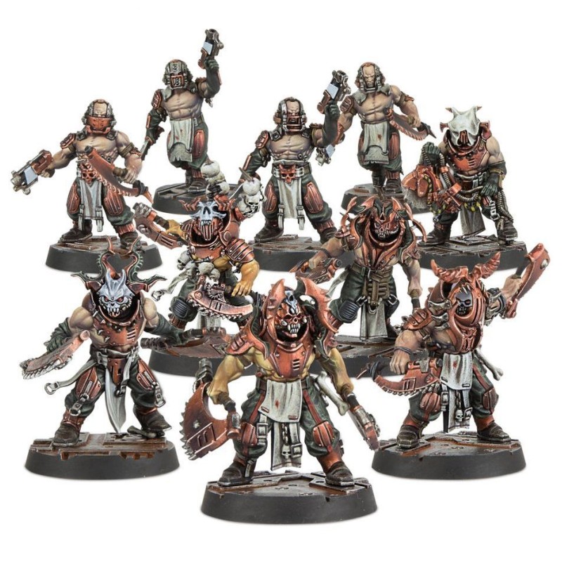 Ce kit de dix Corpse Grinder Cultists a été conçu pour vous offrir une grande variété d'options d'assemblage, afin d'éviter que vos sectes soient toutes les mêmes. Ce kit convient aussi bien à fonder une secte qu'à en renforcer une qui existe déjà. Il comprend de quoi monter 6 Skinners – dont les options pour réaliser un Butcher (Chef) et un Cutter (Champion) – et 4 Initiates. Les Butchers, Cutters et Skinners sont armés d'un brutal assortiment de hachoirs tronçonneurs et de scies circulaires à découper, tandis que les Initiates ont accès à des hachoirs tronçonneurs, épées à désosser et pistolets-mitrailleurs.