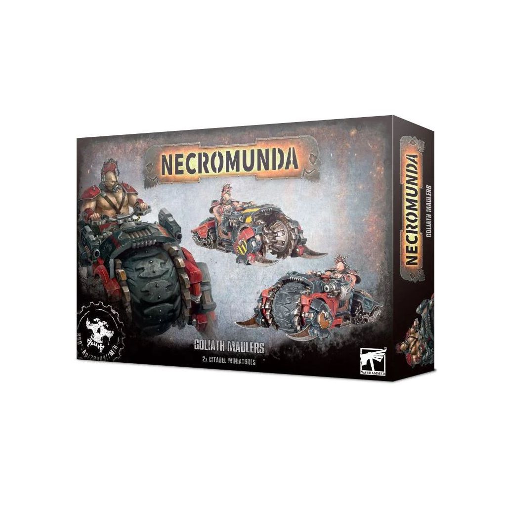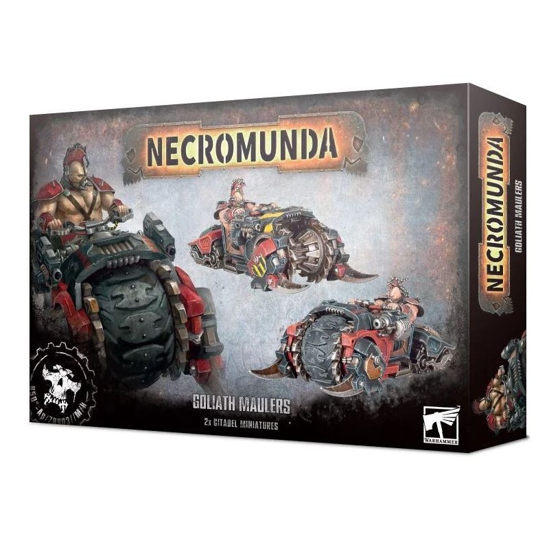 Ce kit plastique permet d'assembler deux Goliath Maulers, des véhicules destructeurs pouvant être ajoutés à votre gang Goliath. Ces motos monstrueuses sont équipées de plaques de blindage et d'un bélier énergétique à pointes, et chacune peut être montée avec, à l'avant, une roue surdimensionnée ou un mécanisme broyeur. Elles disposent d'un point d'emport de chaque côté pouvant recevoir soit des bolters jumelés sooit des lance-grenades jumelés. Chaque Mauler est piloté par un Goliath Road Thug. Ce kit contient un choix de quatre têtes différentes et de deux crêtes interchangeables, pour vous aider à personnaliser les pilotes de vos vééhicules.