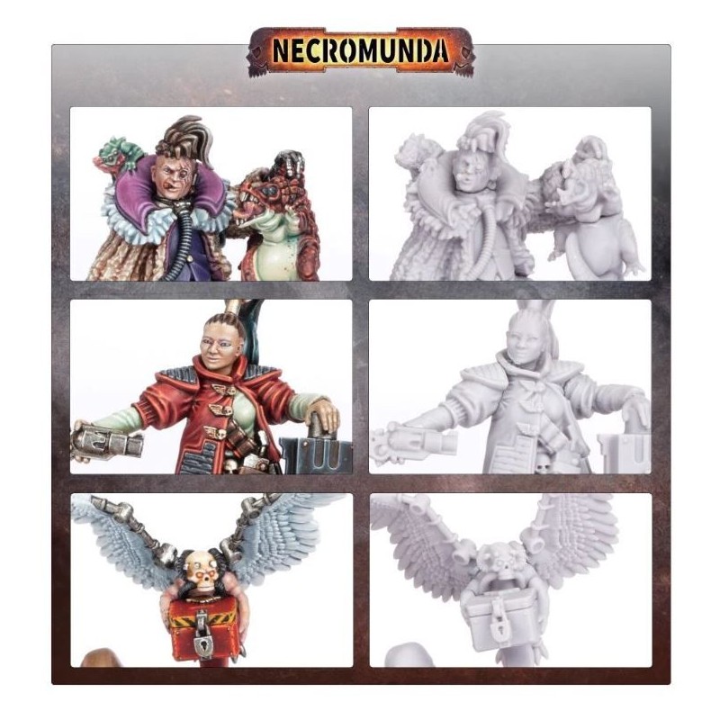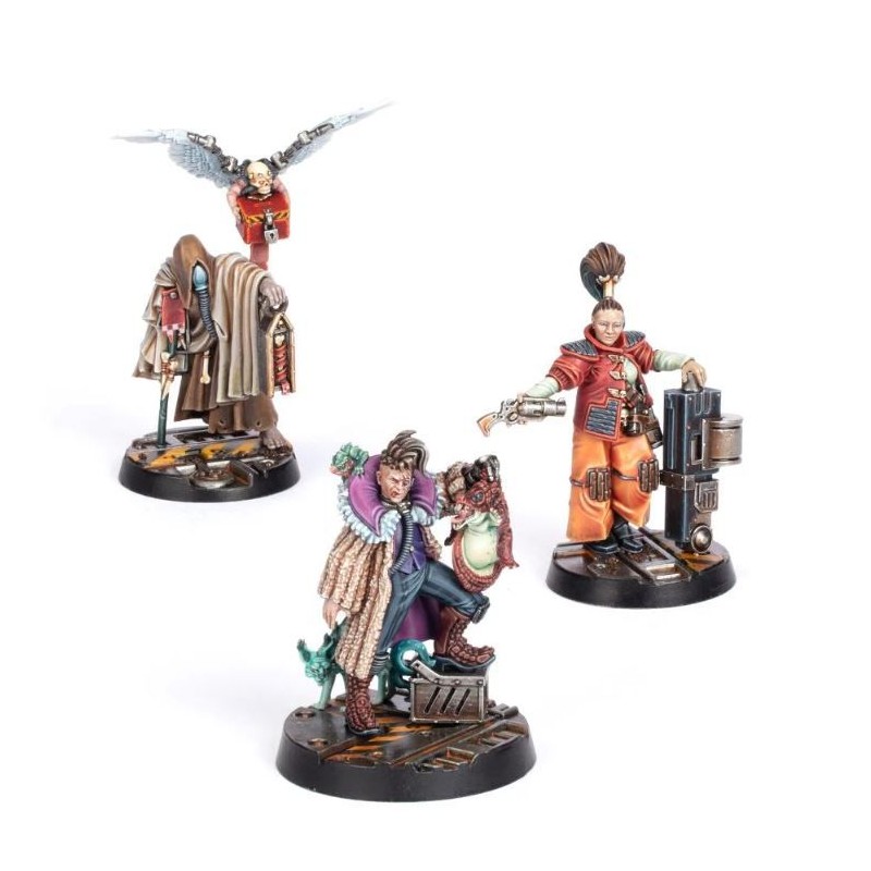 Ce kit en résine en plusieurs parties permet de construire trois commerçants de la ruche - des étrangers spécialisés qui peuvent fournir des services commerciaux aux différents gangs de Necromunda. Le Beastwrangler hisse un jeune sumpkroc dans une main, une petite ménagerie de bêtes apprivoisées rôdant autour de leurs chevilles et de leurs épaules. Le Marchand de reliques est enveloppé de robes mystérieuses et de cybernétique, il brandit un reliquaire sacré et est accompagné d'un chérubin portant une boîte à clé. Le Gun-smyth est chargé de munitions et d'armes à feu et s'appuie sur un bolter lourd et massif qu'il ne peut pas soulever.