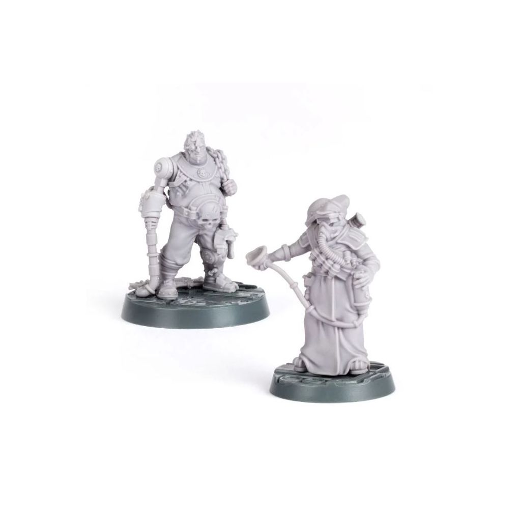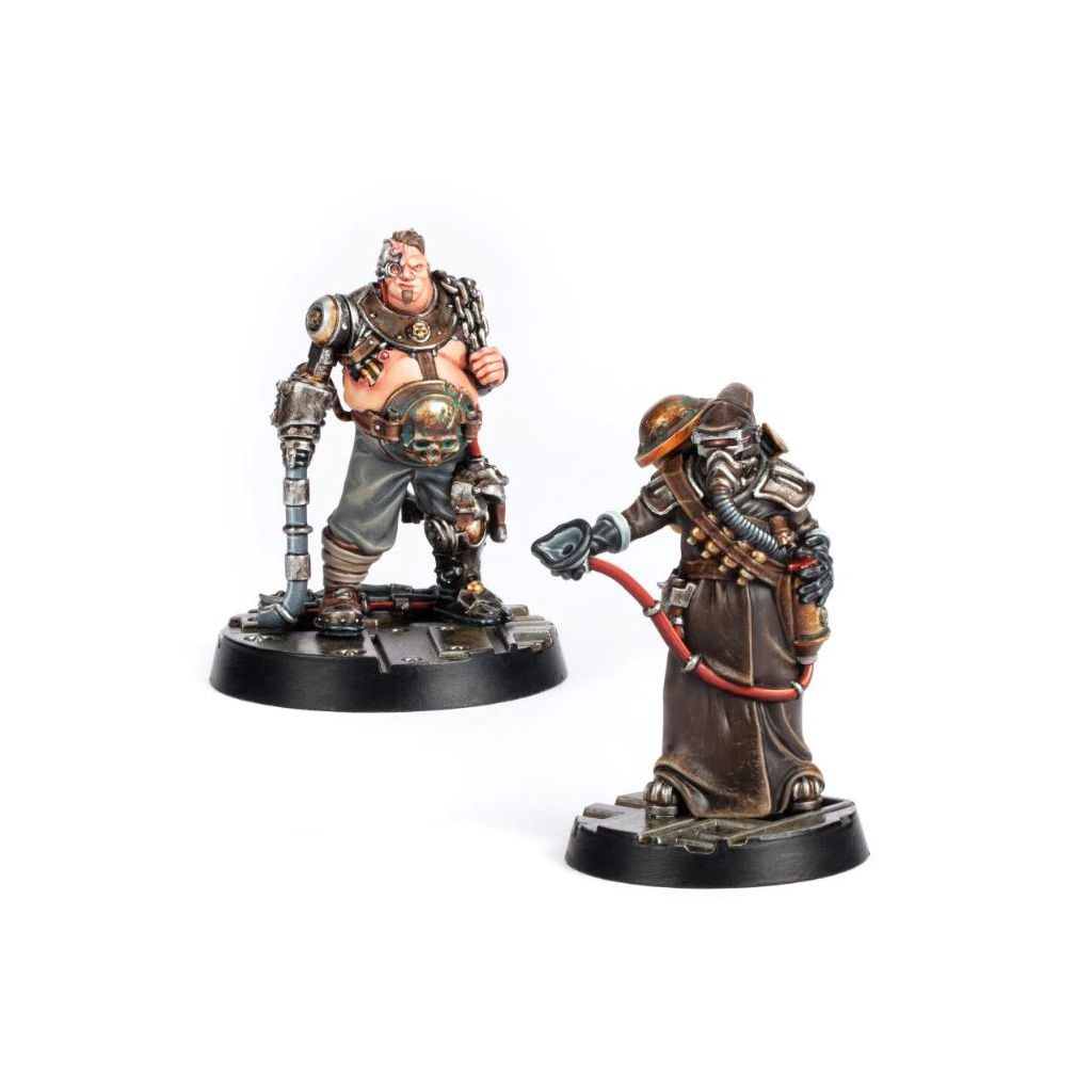 Ce kit en résine en plusieurs parties permet de construire un Brute Handler et un Chem Dealer, des parasites spécialisés disponibles dans tous les gangs, mais particulièrement courants dans les gangs de la Maison Goliath. Le Brute Handler est un personnage costaud, chaînes et menottes en bandoulière, criblé de dispositifs bioniques issus de séances d'entraînement dangereuses - un bras cybernétique se termine par un fouet à chocs enroulé. Le trafiquant de produits chimiques est vêtu de robes dissimulatrices, avec un recycleur facial relié à un réservoir de substances douteuses. Ils sont chargés de fioles et de bidons contenant leurs produits, prêts à offrir un échantillon.