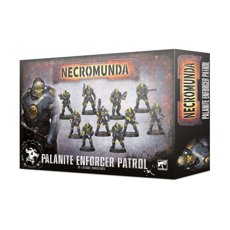 Ce kit plastique est fourni en 156 composants permettant d'assembler 10 Palanite Enforcers, plus 10 socles de 25mm pour Necromunda et une planche de décalcomanies pour Palanite Enforcer Patrol. Les règles pour jouer une Patrouille se trouvent dans The Book of Judgement.