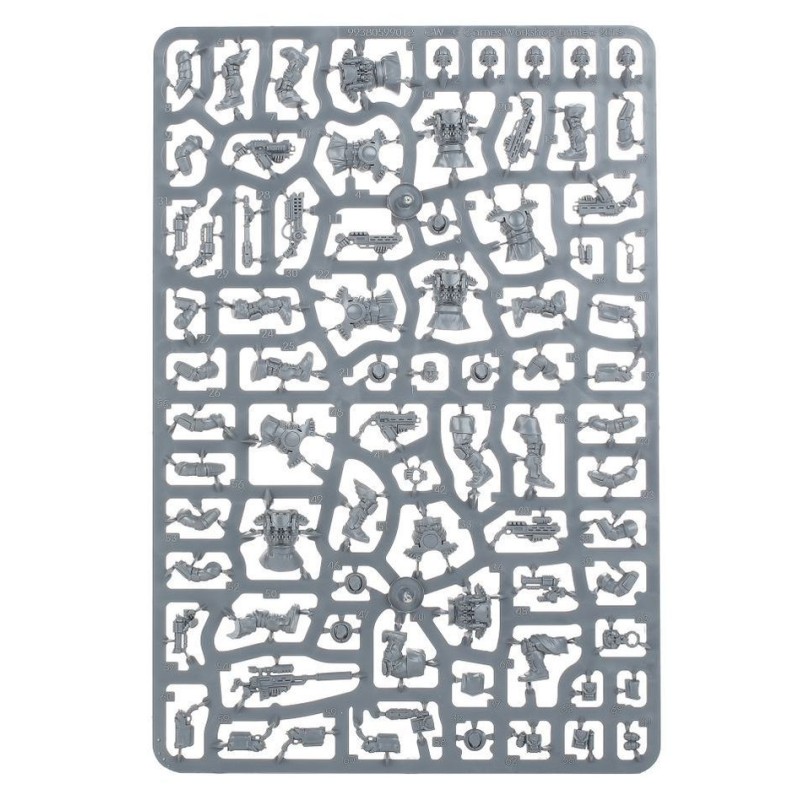 Pour faire leur travail, les Palanite Enforcers disposent d'un arsenal conséquent, avec fusils à pompe, bolters, pistolets-mitrailleurs, flingues, fusils de sniper et autres électrobâtons. Les figurines sont conçues de sorte à être très variées et riches en options d'assemblage, de sorte à pouvoir rendre unique chaque Enforcer. Vous trouverez en tout:
