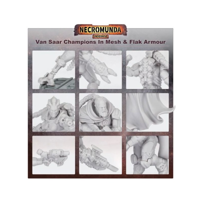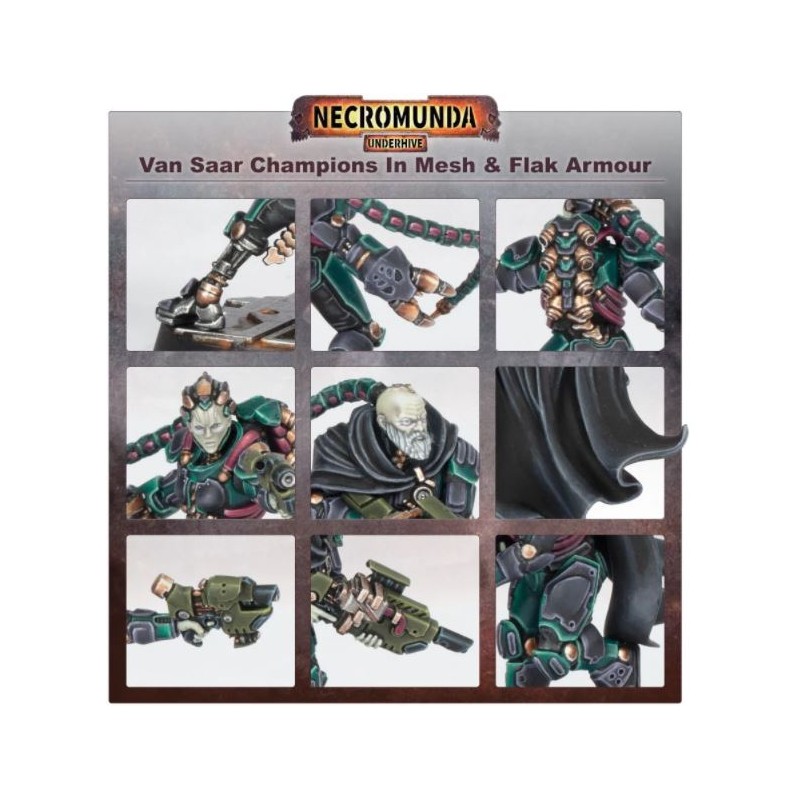 Apportant un mélange de puissance de feu dévastatrice, d'expertise tactique et de technologie ésotérique sur le champ de bataille, ce kit contient deux champions Van Saar - l'un armé d'un pistolet laser, l'autre d'une sous-carabine laser et d'une servo-griffe. L'un porte une armure en maille et l'autre une armure pare-balles, qui peut être utilisée comme Augmek et Archeotek dans les jeux de Necromunda.