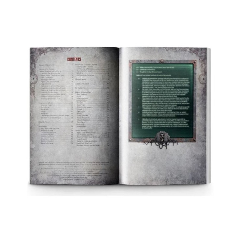 - Scénarios Outlander : Les règles de six nouveaux scénarios sur le thème des Outlanders - Raid sur les colonies, Désordre sur le marché, Attaque furtive, Réservoir de déchets, Expédition minière et Le gros lot - comprenant chacun les règles de la bataille, les récompenses obtenues en cas de victoire, l'expérience, la réputation et les règles spéciales de ces scénarios.
