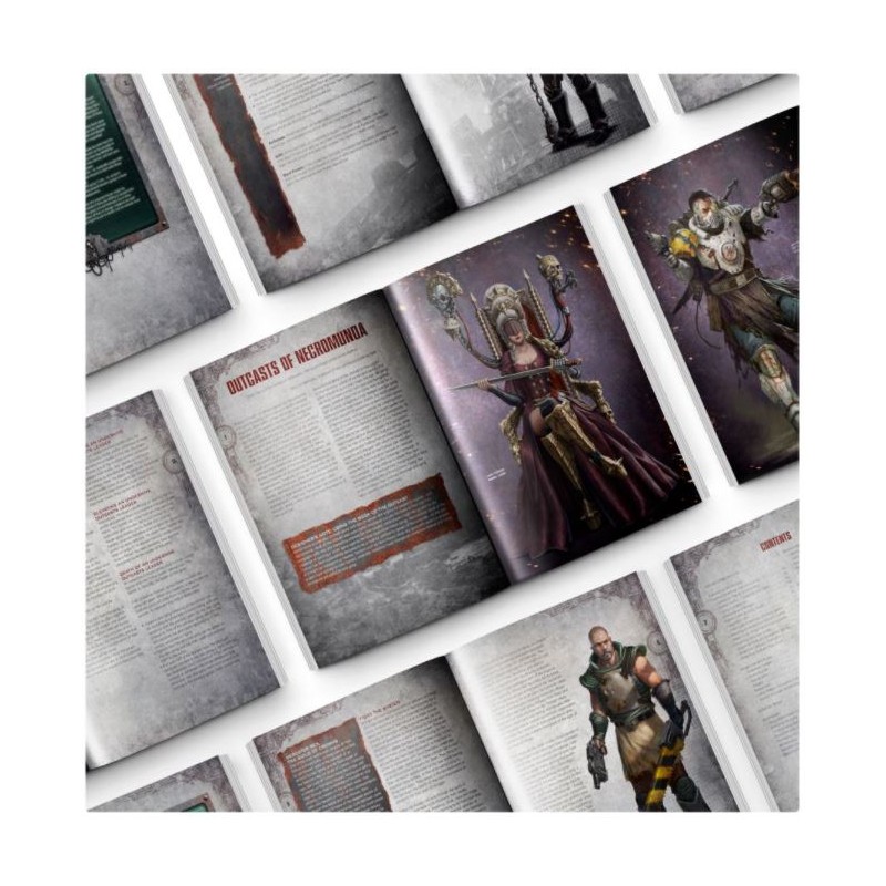 - Les Parias de Necromunda : De nombreuses informations sur les gangs de parias, couvrant des aspects tels que les mauvaises zones, la racaille qui compose un gang de parias de l'Underhive, et les raisons pour lesquelles des membres de l'Underhive aussi mal considérés seraient enclins à s'engager.