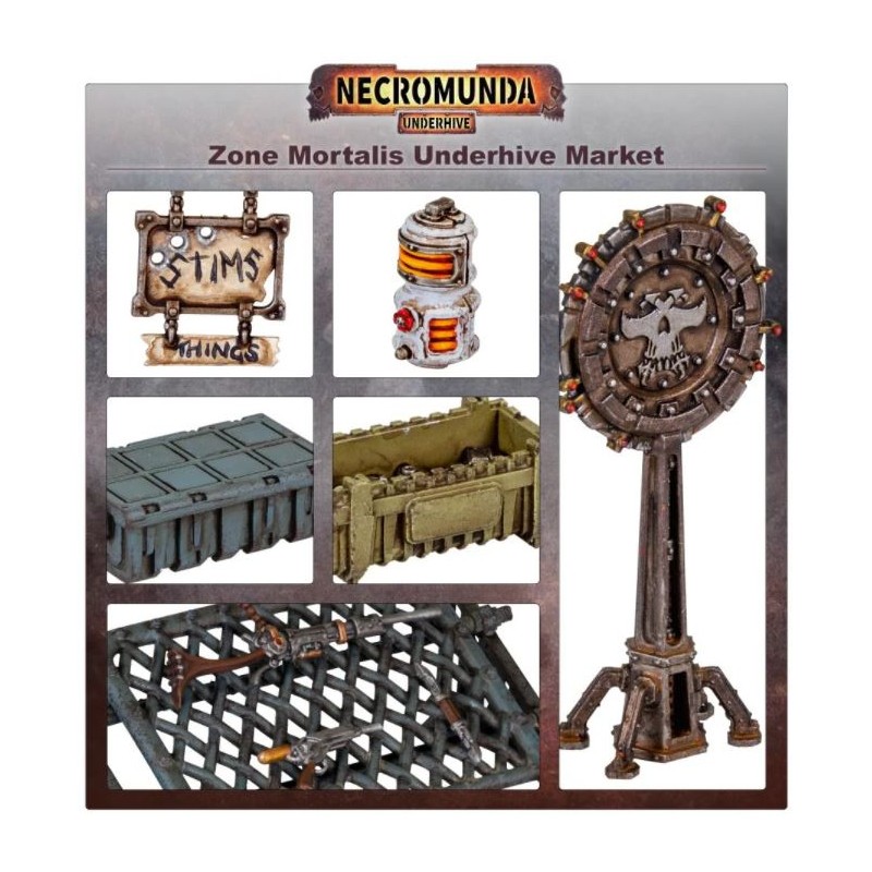 Description du produitMême dans la périlleuse Zone Mortalis, des marchés apparaissent au milieu des tirs croisés tandis que marchands et pique-assiettes essaient de réaliser des ventes éclairs. Pleins de denrées rares, de matériels contrefaits et d'armes désirables, ces marchés labyrinthiques sont souvent des sites de fusillades entre les gangs, et même les Palanite Enforcers n'hésitent pas à utiliser le couvert succinct d'un auvent.