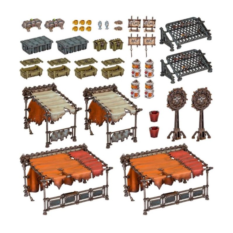 Ce kit vous permet d'assembler vos propres Underhive Markets d'un ost d'éléments et accessoires de terrain, comme des étals de marché, des râteliers d'armes, des cantines de rangement, et les détritus assortis qui jonchent les bazars du Sous-monde.