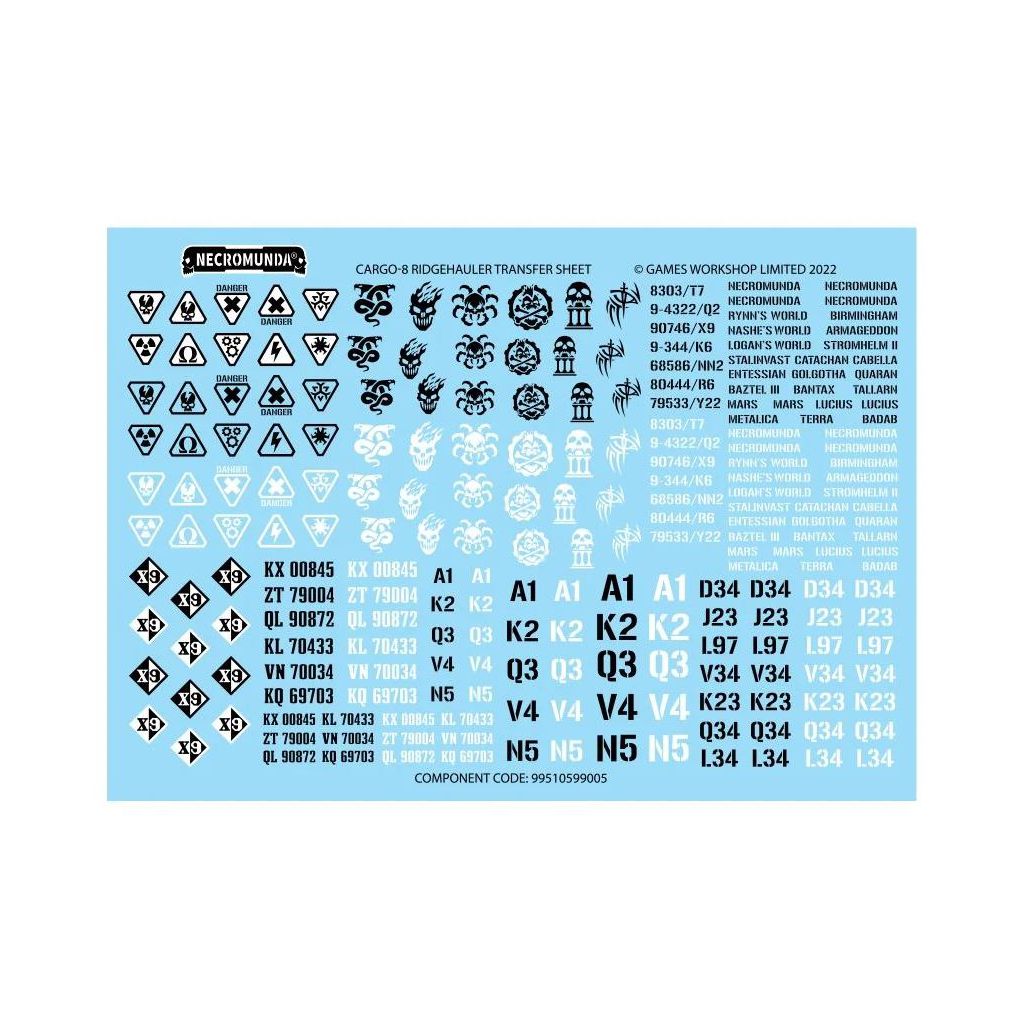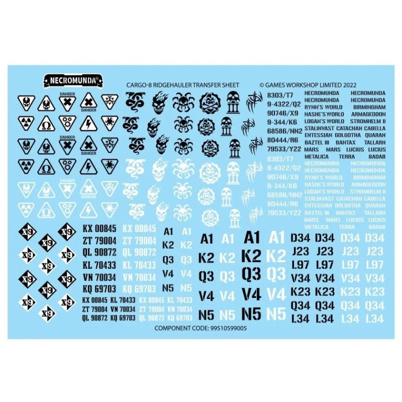 Ce set est composé de 125 éléments en plastique et est fourni avec une Feuille de Décalcos Cargo-8 Ridgehauler comprenant divers signes de véhicules et logos de gang. Cette figurine est fournie non peinte et nécessite assemblage.